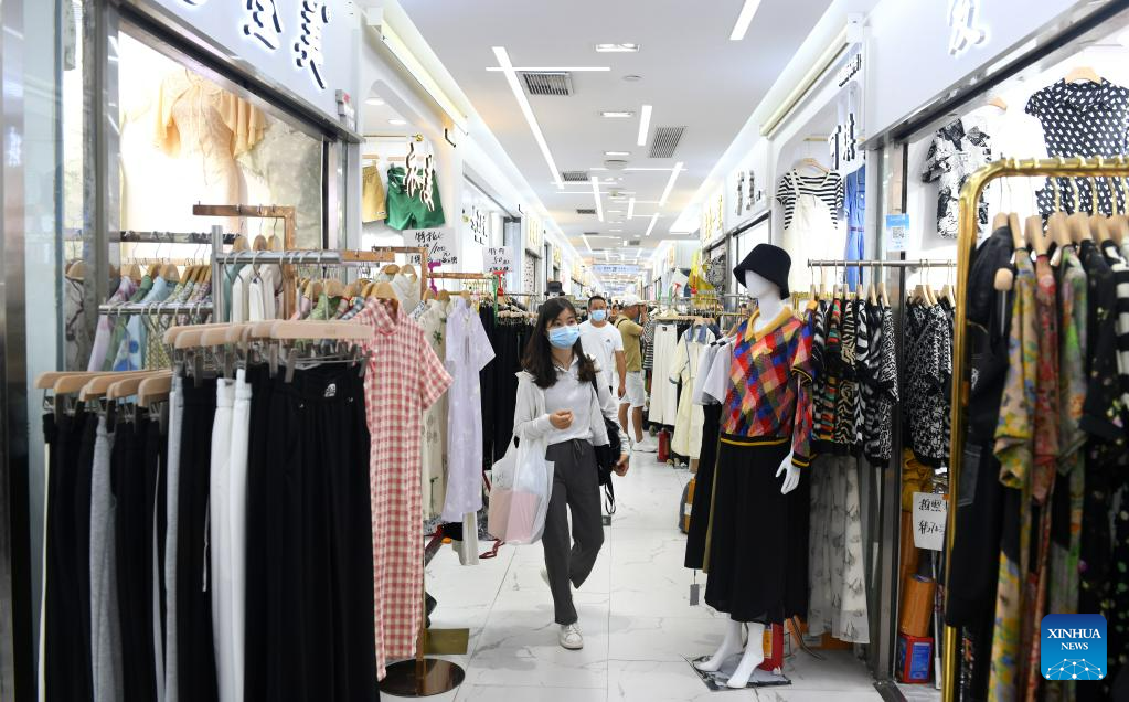 People shop at a clothing wholesale market in Guangzhou, south China's Guangdong Province, June 13, 2023. Guangzhou has a history of more than 2,000 years. The city has been a place of cultural integration between Chinese and foreign cultures since ancient times. It has manifested the openness and inclusiveness involved with Chinese culture. (Xinhua/Lu Hanxin)