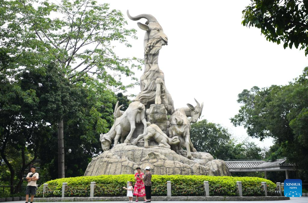 This photo taken on June 13, 2023 shows a stone sculpture themed five sheep at the Yuexiu Park in Guangzhou, south China's Guangdong Province. Guangzhou has a history of more than 2,000 years. The city has been a place of cultural integration between Chinese and foreign cultures since ancient times. It has manifested the openness and inclusiveness involved with Chinese culture. (Xinhua/Deng Hua)