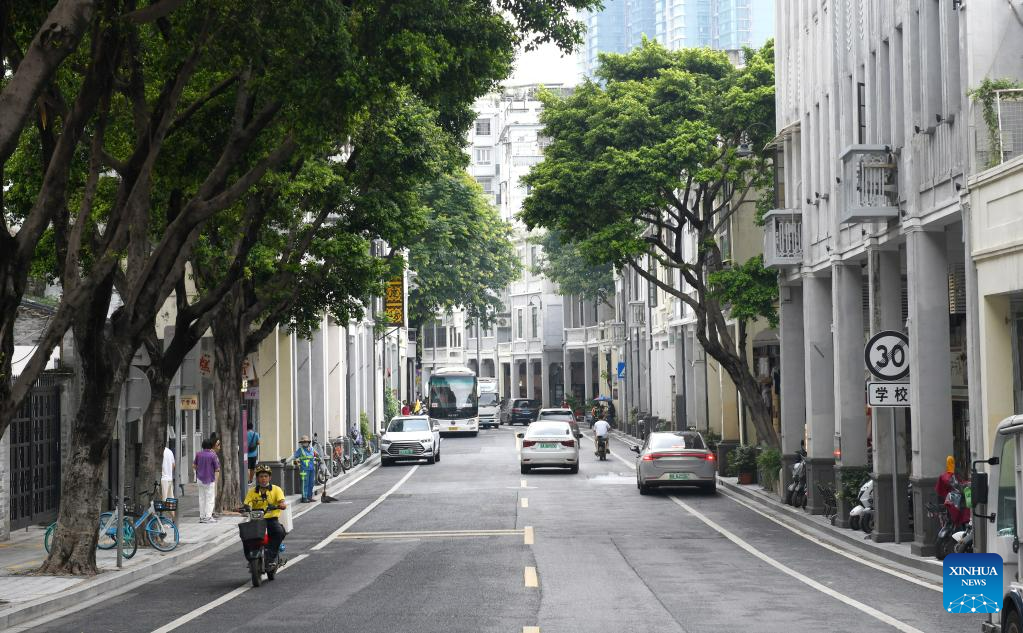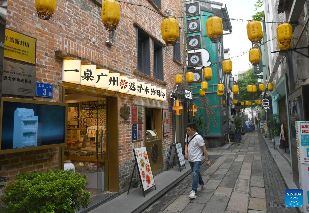 This photo taken on June 14, 2023 shows a view of the Qilou street in Guangzhou, south China's Guangdong Province. Guangzhou has a history of more than 2,000 years. The city has been a place of cultural integration between Chinese and foreign cultures since ancient times. It has manifested the openness and inclusiveness involved with Chinese culture. (Xinhua/Lu Hanxin)
