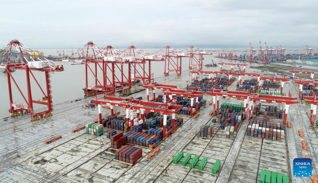 This aerial photo taken on June 16, 2022 shows the fully-automated pier at the Nansha port in Guangzhou, south China's Guangdong Province. Guangzhou has a history of more than 2,000 years. The city has been a place of cultural integration between Chinese and foreign cultures since ancient times. It has manifested the openness and inclusiveness involved with Chinese culture. (Xinhua/Lu Hanxin)