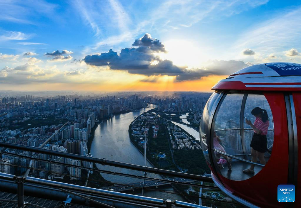 People enjoy sunset inside a ferris wheel at Canton Tower in Guangzhou, south China's Guangdong Province, Aug. 7, 2022. Guangzhou has a history of more than 2,000 years. The city has been a place of cultural integration between Chinese and foreign cultures since ancient times. It has manifested the openness and inclusiveness involved with Chinese culture. (Xinhua/Liu Dawei)