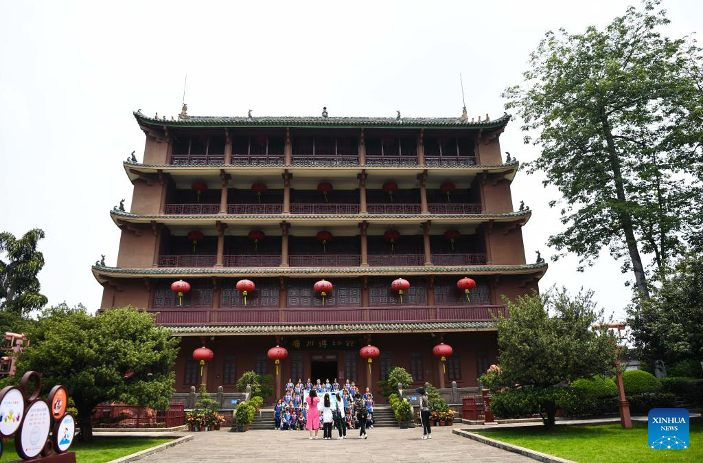 Visitors pose for a group photo in front of the Zhenhai building of the Guangzhou Museum in Guangzhou, south China's Guangdong Province, June 13, 2023. Guangzhou has a history of more than 2,000 years. The city has been a place of cultural integration between Chinese and foreign cultures since ancient times. It has manifested the openness and inclusiveness involved with Chinese culture. (Xinhua/Deng Hua)