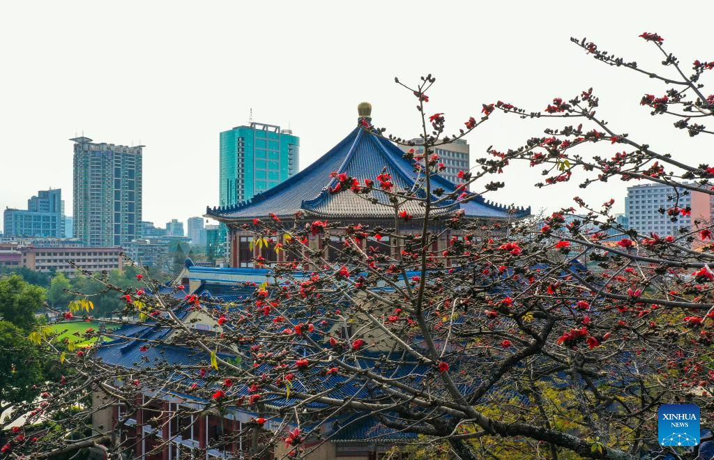 This aerial photo taken on Feb. 19, 2020 shows the Kapok flowers beside the Sun Yat-sen Memorial Hall in Guangzhou, south China's Guangdong Province. Guangzhou has a history of more than 2,000 years. The city has been a place of cultural integration between Chinese and foreign cultures since ancient times. It has manifested the openness and inclusiveness involved with Chinese culture. (Xinhua/Liu Dawei)