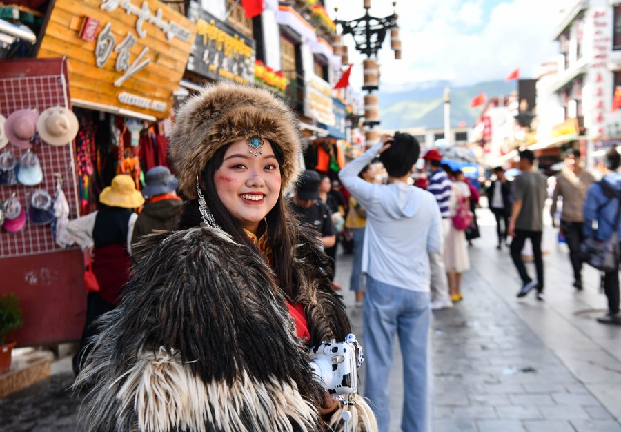 A tourist poses for photos at Barkhor Street in Lhasa, southwest China's Tibet Autonomous Region, July 23, 2021. (Xinhua/Jigme Dorge)