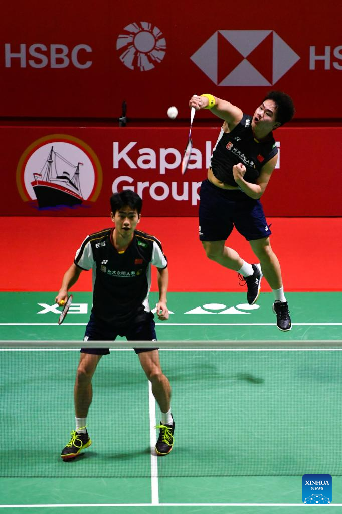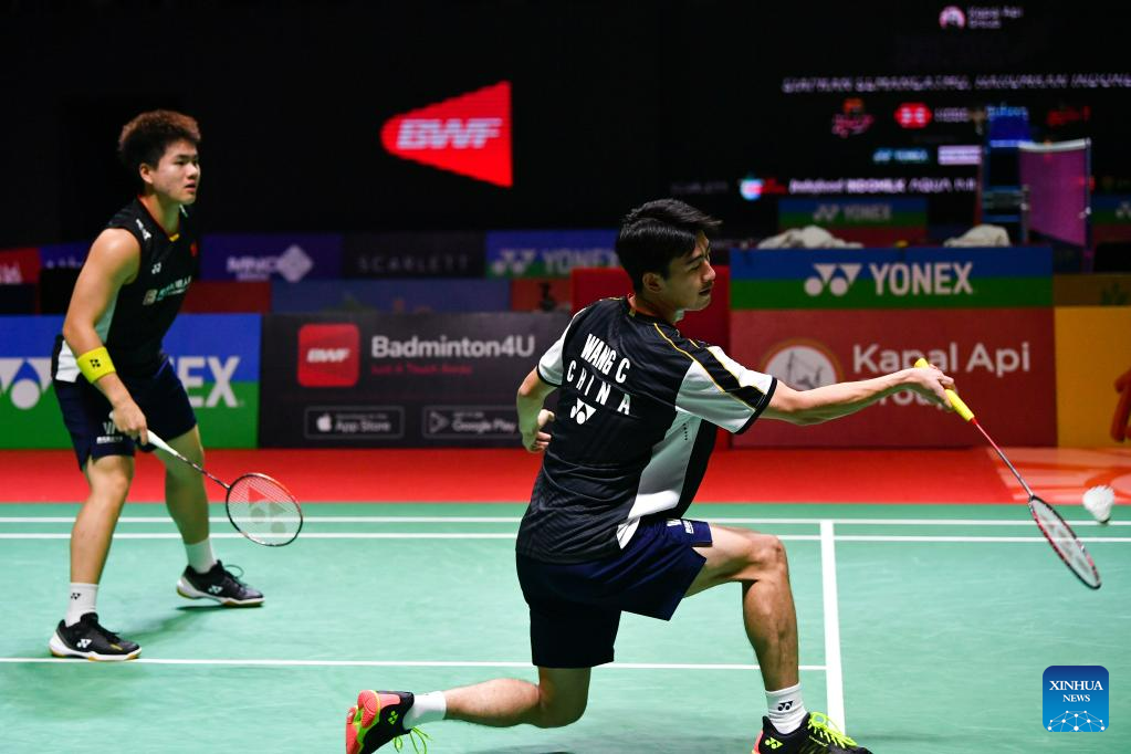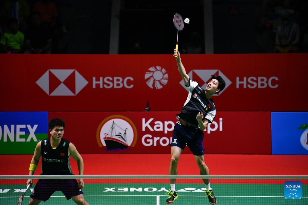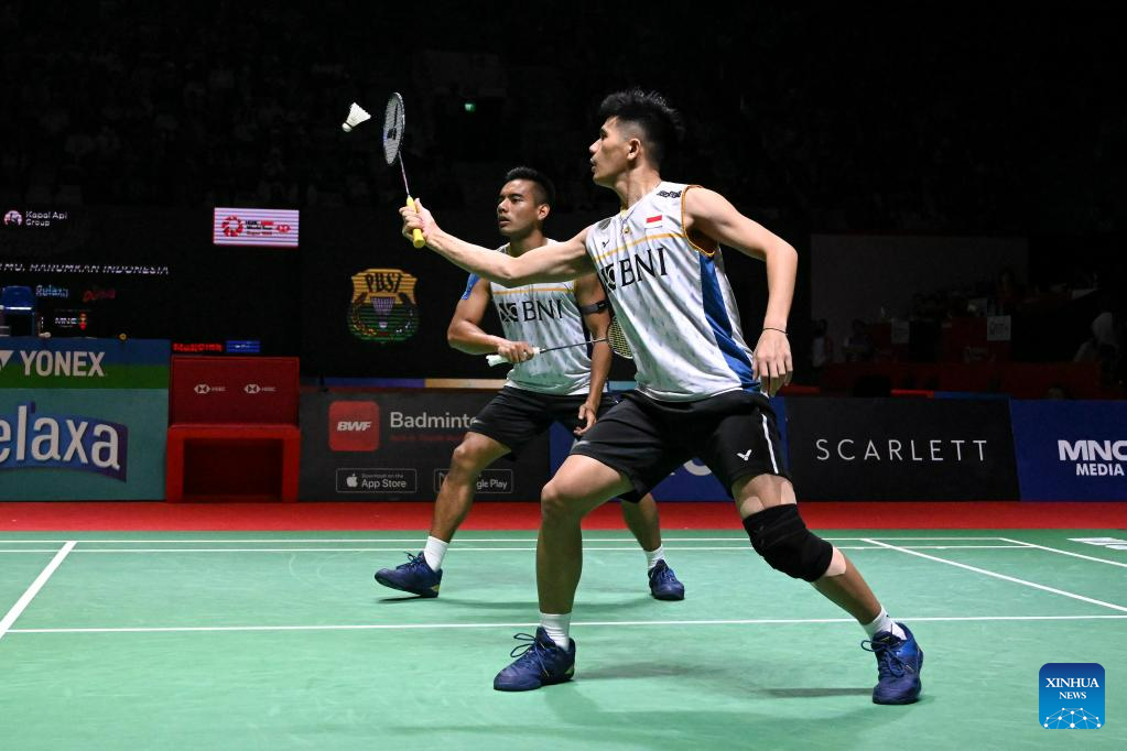 Liang Weikeng (R)/Wang Chang of China compete during the men's doubles quarter final match against Pramudya Kusumawardana/Yeremia Erich Yoche Yacob Rambitan of Indonesia at Indonesia Open 2023 in Jakarta, Indonesia, June 16, 2023. (Xinhua/Xu Qin)
