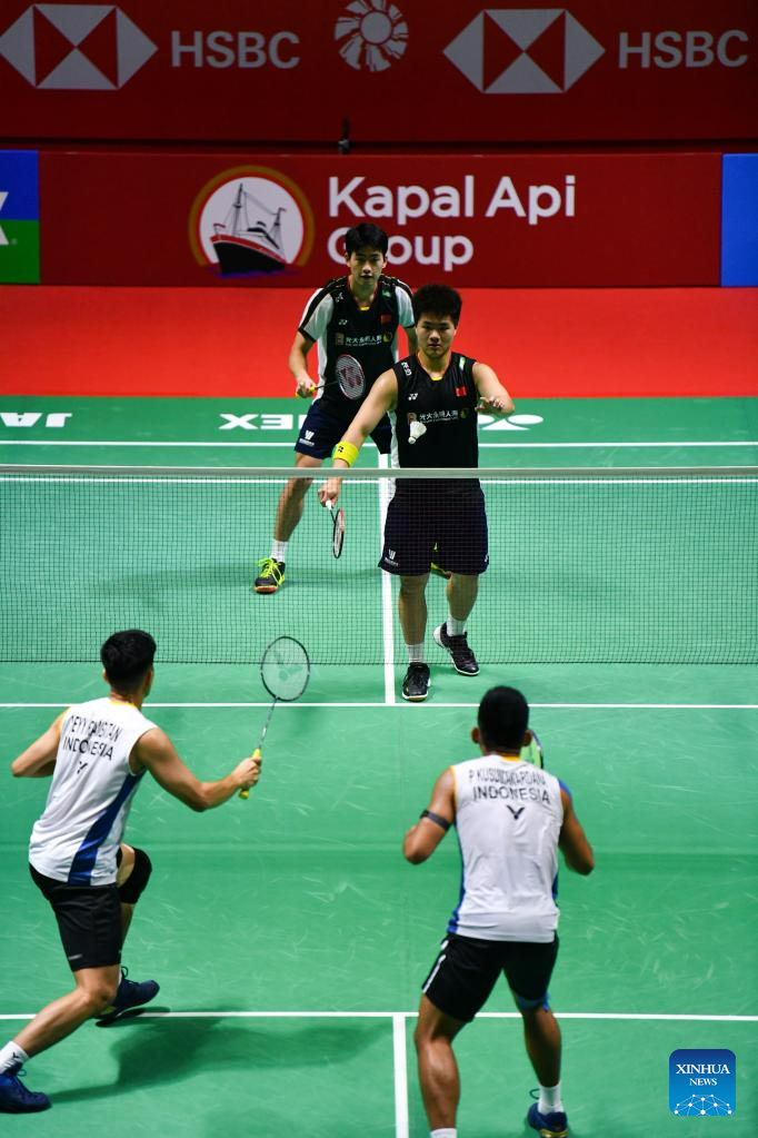 Liang Weikeng (top R)/Wang Chang(top L) of China compete during the men's doubles quarter final match against Pramudya Kusumawardana/Yeremia Erich Yoche Yacob Rambitan of Indonesia at Indonesia Open 2023 in Jakarta, Indonesia, June 16, 2023. (Xinhua/Xu Qin)