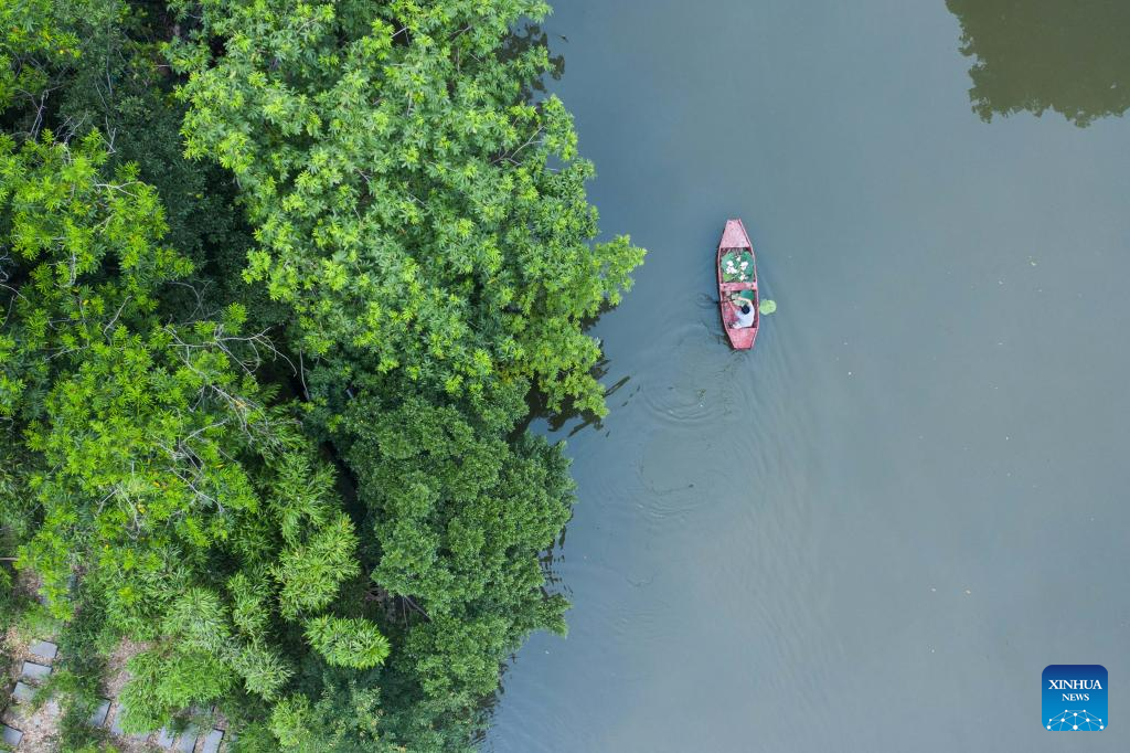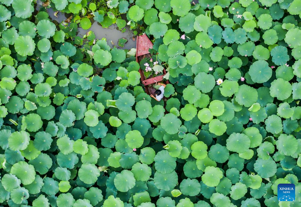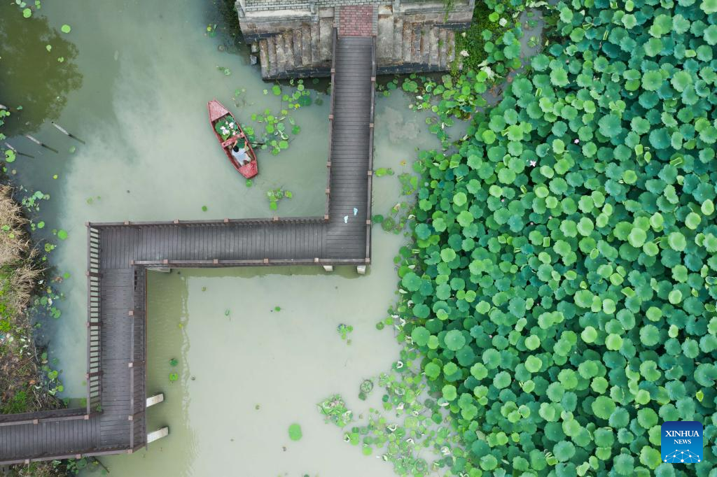 This aerial photo shows a villager rowing a boat while collecting lotus flowers and leaves to make tourist souvenirs in Quanxin Village of Donglin Town, Huzhou, east China's Zhejiang Province, June 16, 2023. Under Zhejiang's Green Rural Revival Program, Donglin Town has been focusing on building a beautiful countryside based on its featured cultural and natural resources, making every effort to achieve green and sustainable development while maintaining economic gains. (Xinhua/Xu Yu)