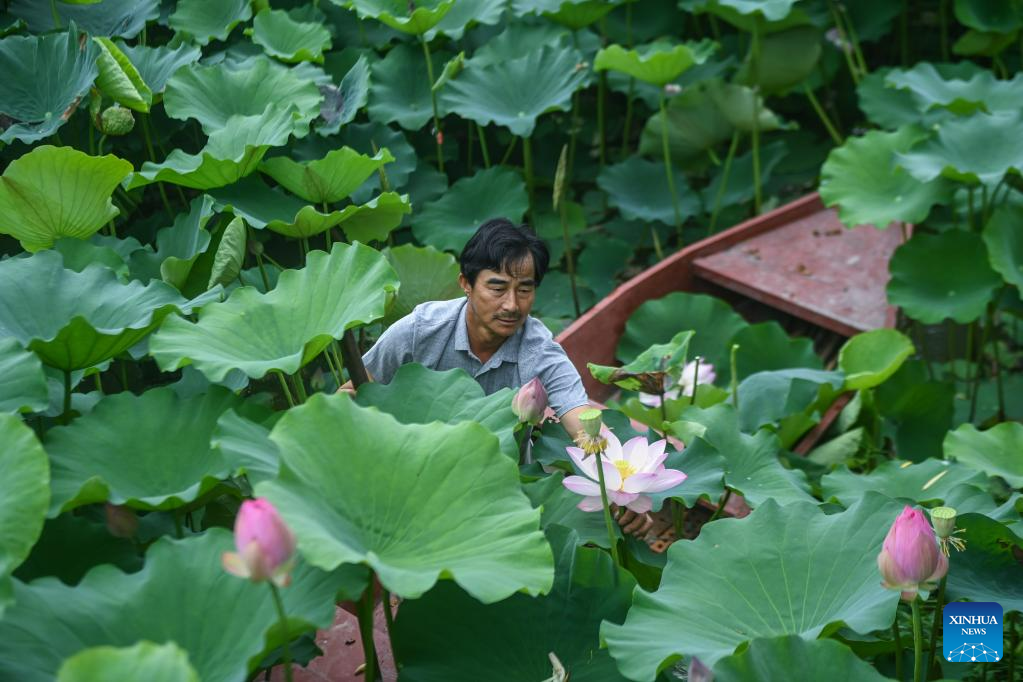 A villager collects lotus flowers and leaves in a boat in Quanxin Village of Donglin Town, Huzhou, east China's Zhejiang Province, June 16, 2023. Under Zhejiang's Green Rural Revival Program, Donglin Town has been focusing on building a beautiful countryside based on its featured cultural and natural resources, making every effort to achieve green and sustainable development while maintaining economic gains. (Xinhua/Xu Yu)