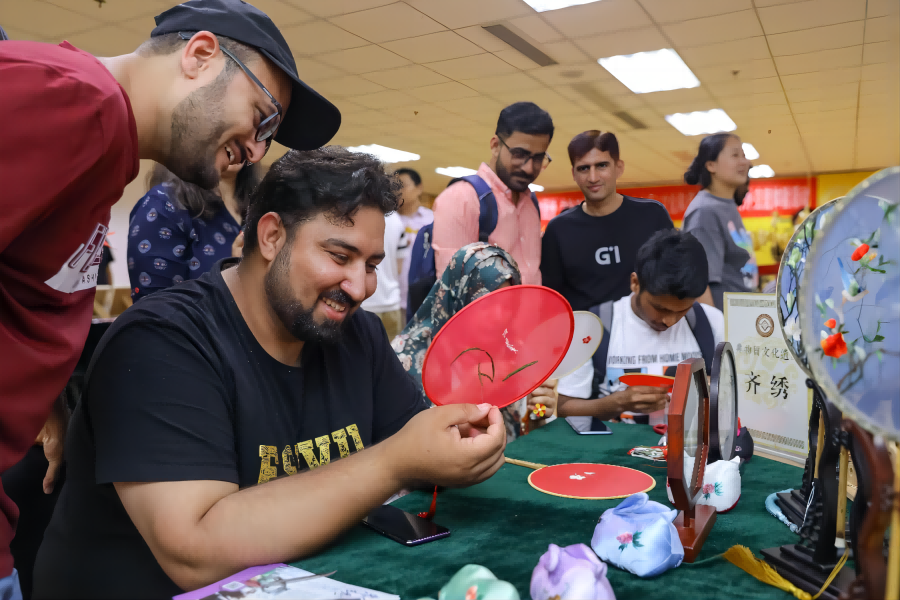 Foreign students experience traditional Chinese embroidery in Licang district, Qingdao, east China's Shandong province. (Photo by Zhang Ying/People's Daily Online)