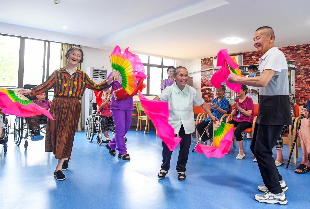 Seniors of a nursing home in Yichun, east China's Jiangxi province dance with staff members of the nursing home. (Photo by Zhou Liang/People's Daily Online)