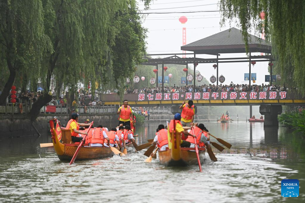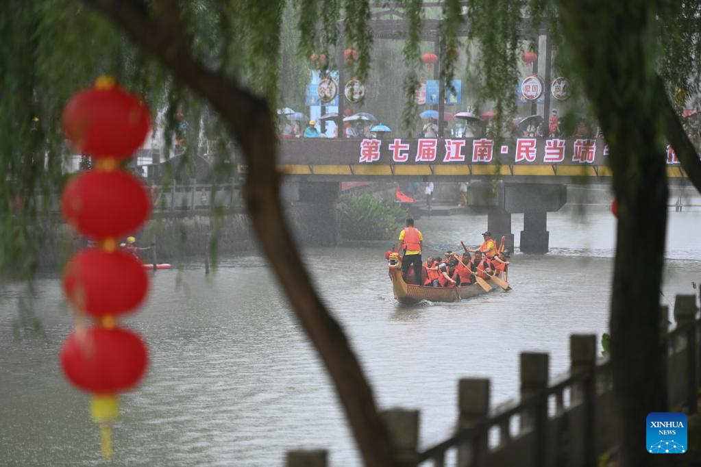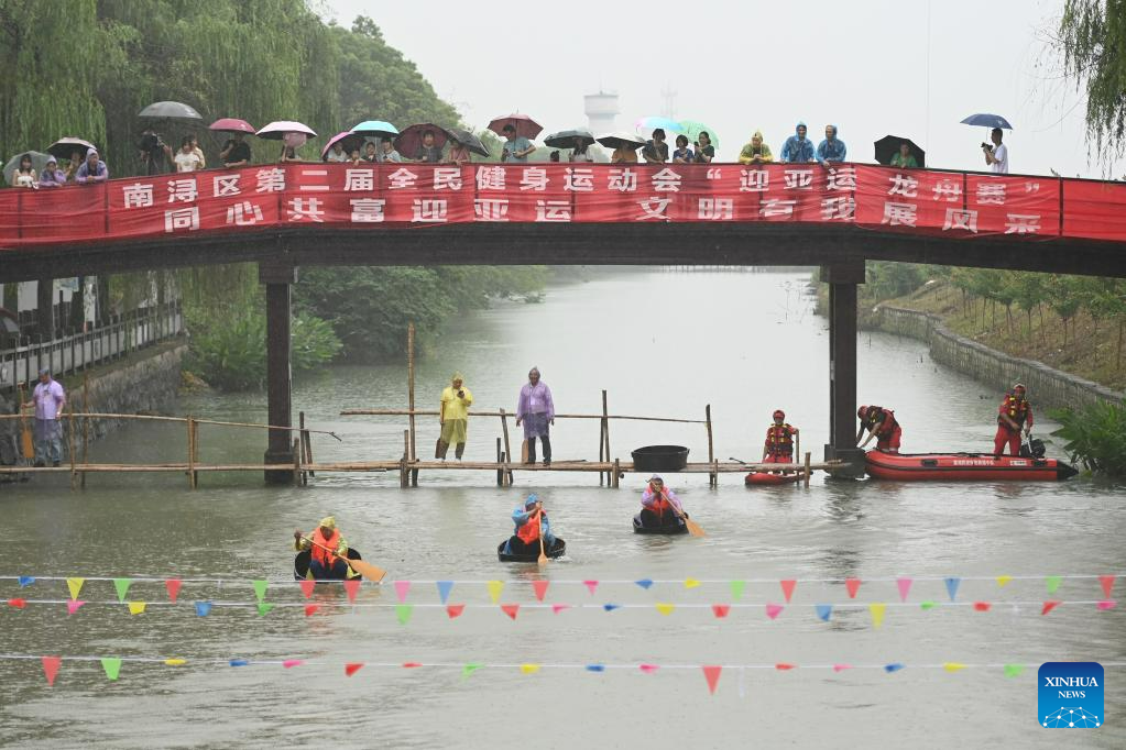 Villagers participate in a dragon boat race to mark the upcoming traditional Chinese Dragon Boat Festival, in Mindang Village of Hefu Town, Huzhou City, east China's Zhejiang Province, June 18, 2023. Dragon Boat Festival, also known as Duanwu Festival, is a traditional holiday in China. It is celebrated on the fifth day of the fifth month of the Chinese lunar calendar. (Xinhua/Huang Zongzhi)