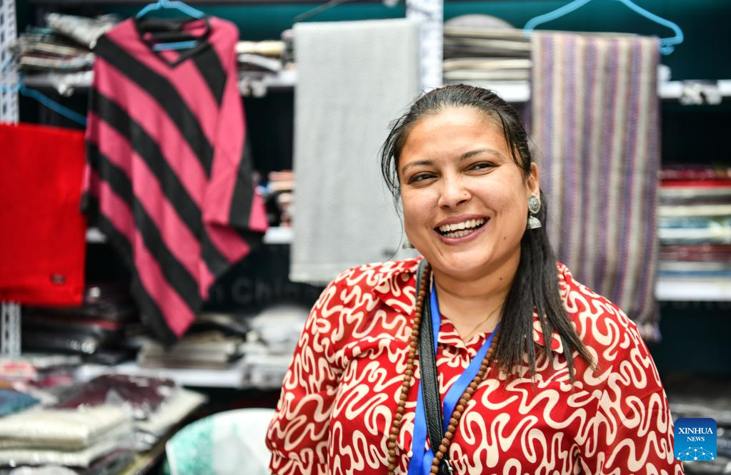 An Indian trader sells products at the 5th China Xizang Tourism and Culture Expo in Lhasa, capital of southwest China's Tibet Autonomous Region, June 18, 2023. The expo is one of the most important events on Tibet's cultural calendar. (Xinhua/Jigme Dorje)