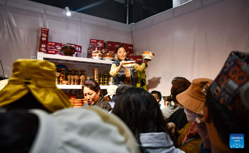 A visitor learns about Tibetan products at the 5th China Xizang Tourism and Culture Expo in Lhasa, capital of southwest China's Tibet Autonomous Region, June 18, 2023. The expo is one of the most important events on Tibet's cultural calendar. (Xinhua/Sun Fei)