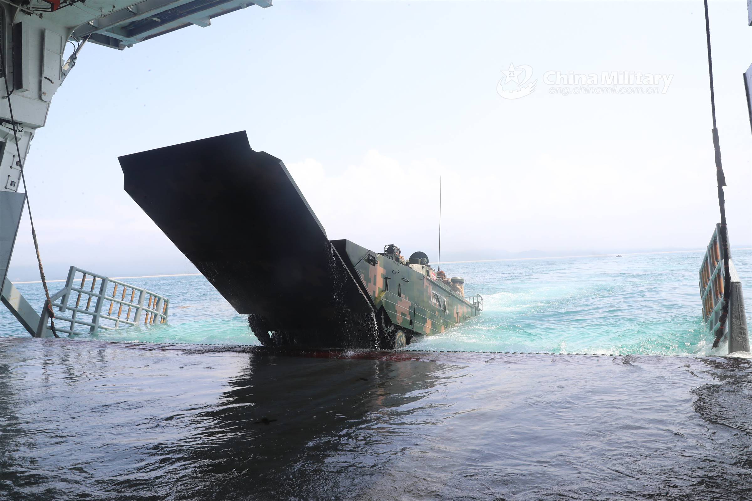 An amphibious infantry fighting vehicle attached to a brigade of the PLA 74th Group Army embarks on the well deck of a landing ship during a recent amphibious assault training exercise. (eng.chinamil.com.cn/Photo by Li Bin)