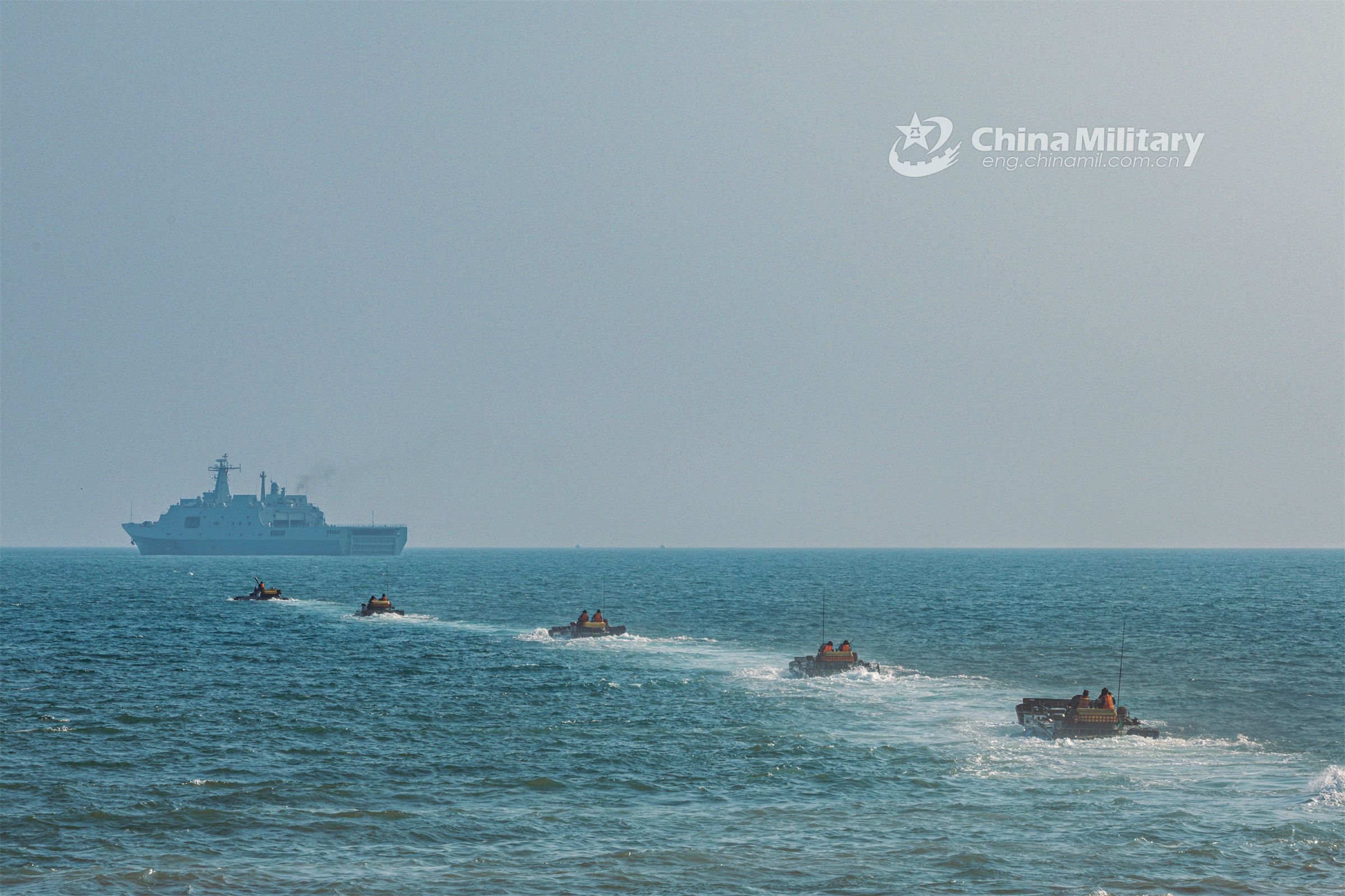 A group of amphibious armored vehicles attached to a brigade of the PLA 74th Group Army maneuver towards designated target area in formation to make their ways to the beach-head during a recent amphibious assault training exercise. (eng.chinamil.com.cn/Photo by Li Bin)