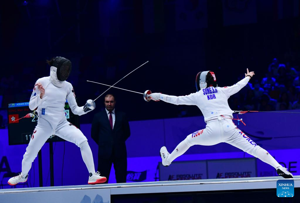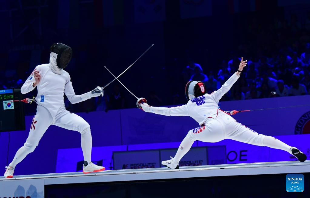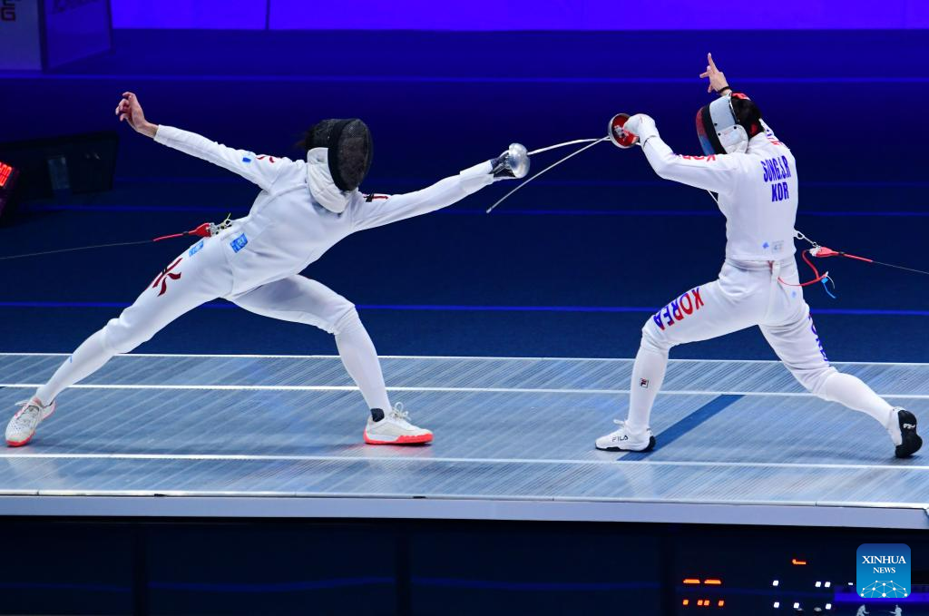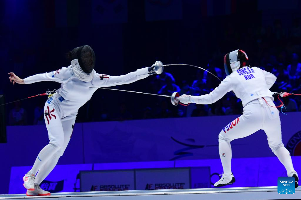 Kong Man Wai (L) of China's Hong Kong competes with Song Se-ra of South Korea during the women's epee individual final match of Asian Fencing Championships in Wuxi of east China's Jiangsu Province, on June 17, 2023. (Photo by Huan Yueliang/Xinhua)