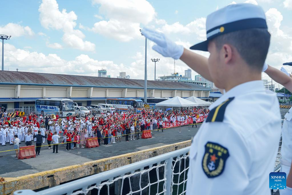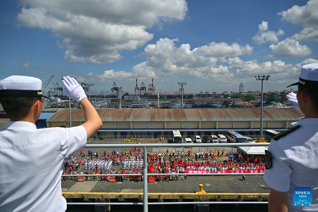 People see off crew members of Chinese naval training ship Qi Jiguang (Hull 83) at a farewell ceremony at South Harbor in Manila, the Philippines, June 17, 2023. The Chinese naval training ship Qi Jiguang (Hull 83) departed for China on Saturday after successfully concluding its goodwill visit to the Philippines. (Xinhua)