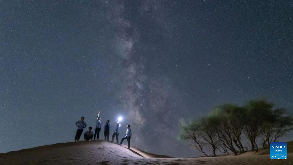 This undated photo shows visitors watching stars at the Shapotou scenic spot in Zhongwei, northwest China's Ningxia Hui Autonomous Region. (Xinhua)