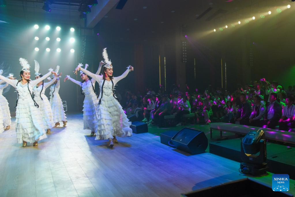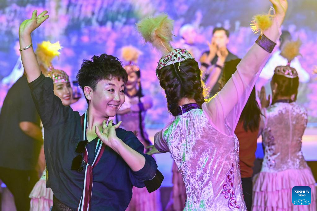 Tourists watch a performance at Huiyuan ancient town in Huocheng County, northwest China's Xinjiang Uygur Autonomous Region, June 16, 2023. Swathes of beautiful lavender is luring a large number of tourists to Huocheng County. An international lavender tourism festival kicked off in Huocheng on June 15. (Xinhua/Ding Lei)