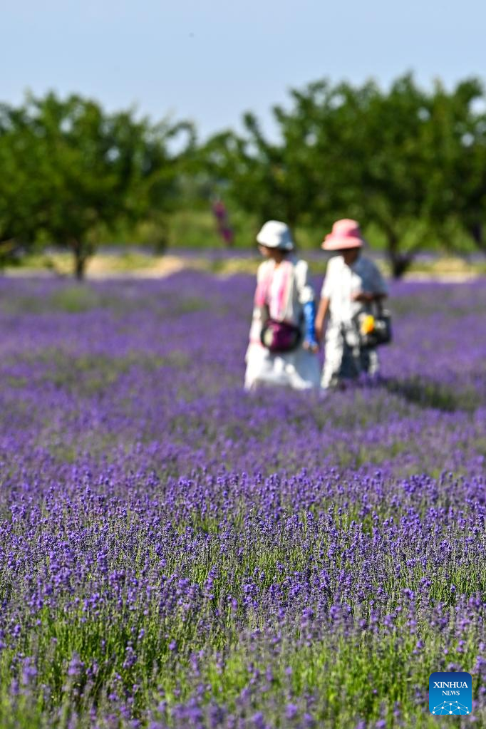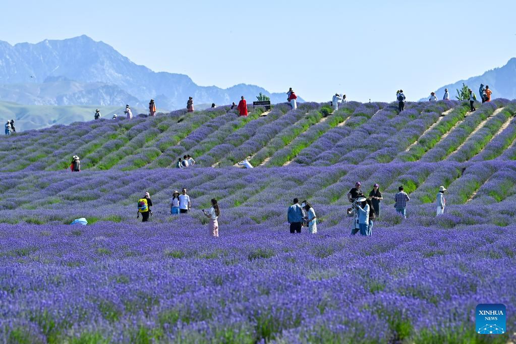 Tourists visit a lavender farm in Sigong Village of Huocheng County, northwest China's Xinjiang Uygur Autonomous Region, June 16, 2023. Swathes of beautiful lavender is luring a large number of tourists to Huocheng County. An international lavender tourism festival kicked off in Huocheng on June 15. (Xinhua/Ding Lei)