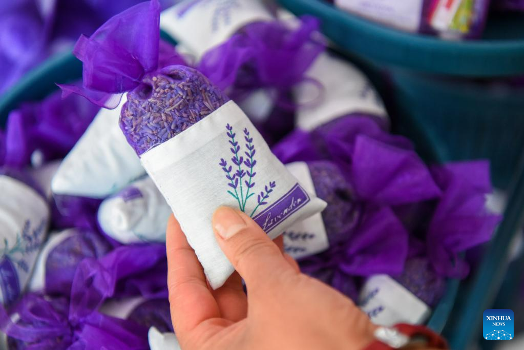 A tourist selects lavender products in Sigong Village of Huocheng County, northwest China's Xinjiang Uygur Autonomous Region, June 16, 2023. Swathes of beautiful lavender is luring a large number of tourists to Huocheng County. An international lavender tourism festival kicked off in Huocheng on June 15. (Xinhua/Ding Lei)