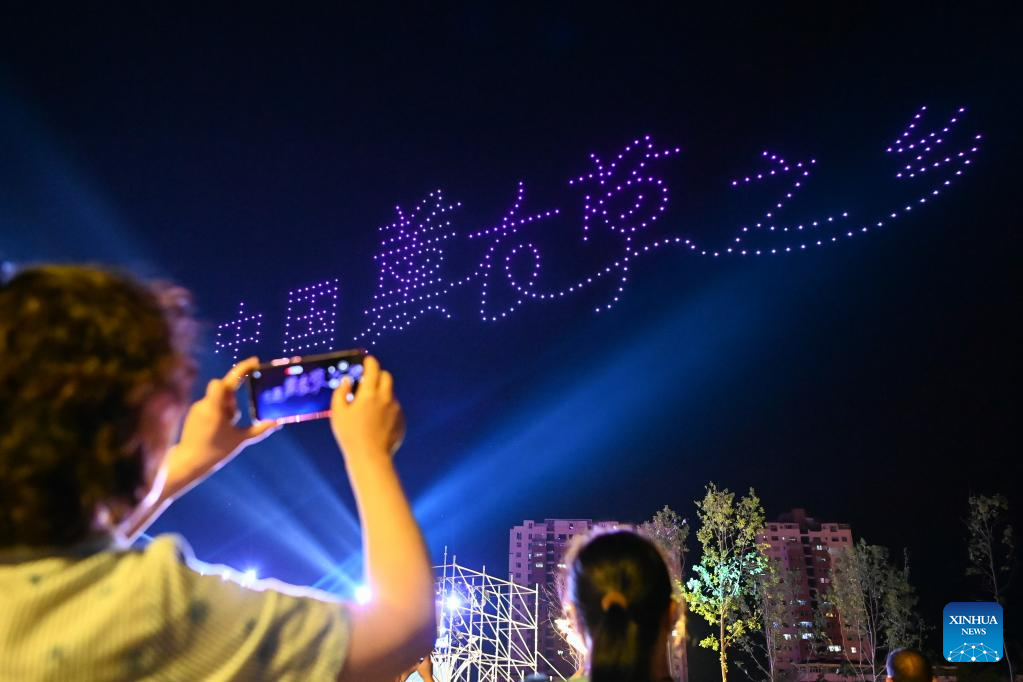 Tourists watch a drone performance at a park in Huocheng County,northwest China's XinjiangUygur Autonomous Region, June 16, 2023. Swathes of beautiful lavender is luring a large number of tourists to Huocheng County. An international lavender tourism festival kicked off in Huocheng on June 15. (Xinhua/Ding Lei)