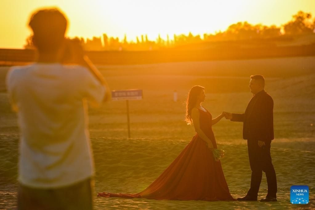 People pose for wedding photos in Huocheng County, northwest China's Xinjiang Uygur Autonomous Region, June 16, 2023. Swathes of beautiful lavender is luring a large number of tourists to Huocheng County. An international lavender tourism festival kicked off in Huocheng on June 15. (Xinhua/Ding Lei)