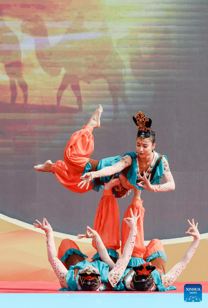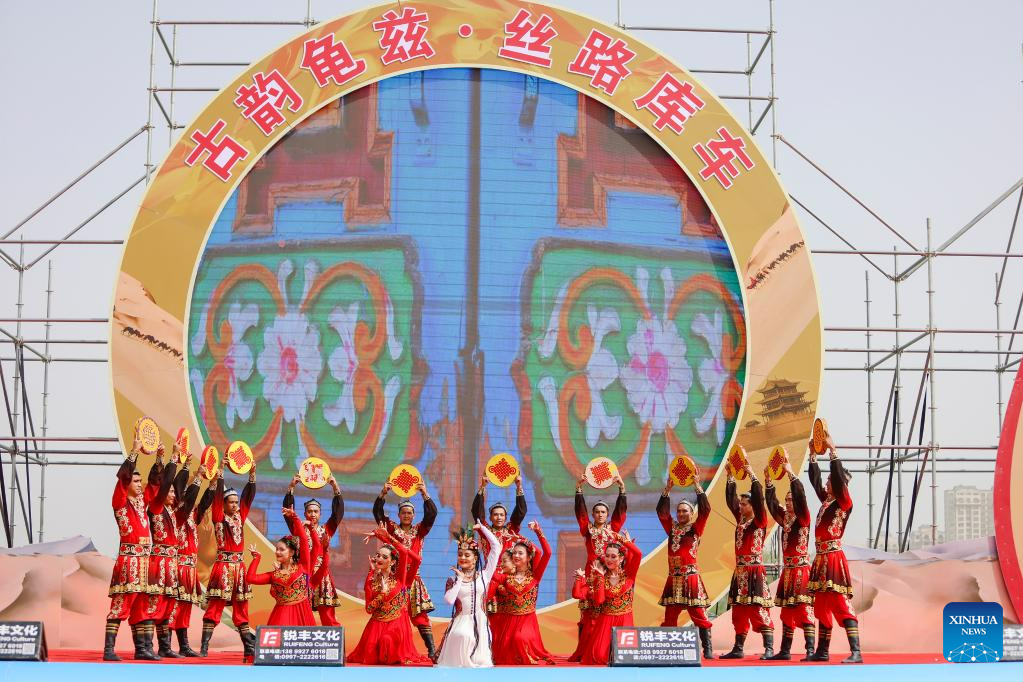 Danceers perform at the opening ceremony of the Qiuci culture and tourism festival in Kuqa City of Aksu Prefecture, northwest China's Xinjiang Uygur Autonomous Region, June 17, 2023. The Qiuci culture tourism festival kicked off here on Saturday. (Xinhua/Hao Zhao)