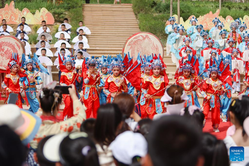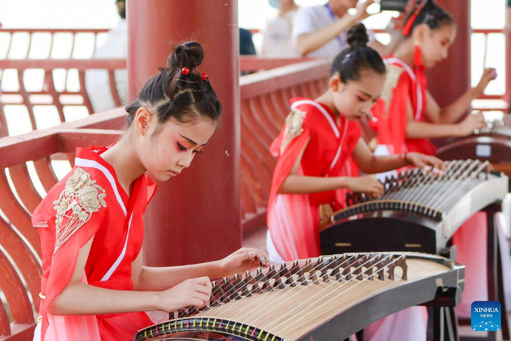 Children play guzheng, a traditional Chinese musical instrument, during the Qiuci culture and tourism festival in Kuqa City of Aksu Prefecture, northwest China's Xinjiang Uygur Autonomous Region, June 17, 2023. The Qiuci culture tourism festival kicked off here on Saturday. (Xinhua/Hao Zhao)