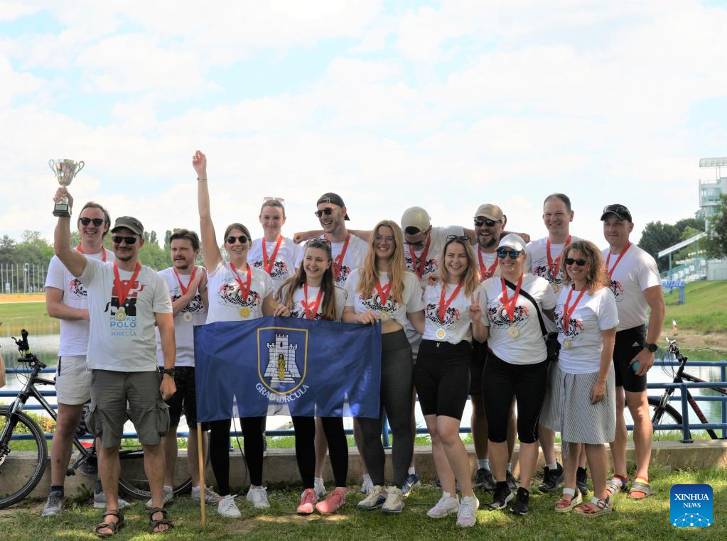 Members of a team from Korcula in southern Croatia celebrate victory after winning the first place in a dragon boat race held on the Jarun Lake in Zagreb, Croatia, on June 17, 2023. The dragon boat race held at the Jarun Lake in the southwest part of the Croatian capital on Saturday was part of activities organized by the Confucius Institute at the University of Zagreb to celebrate the Dragon Boat Festival. It was the eighth that kind of event held in Zagreb. (Xinhua/Li Xuejun)