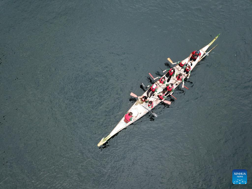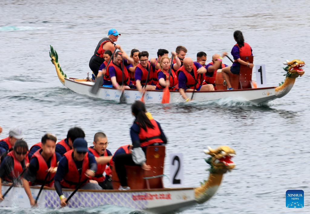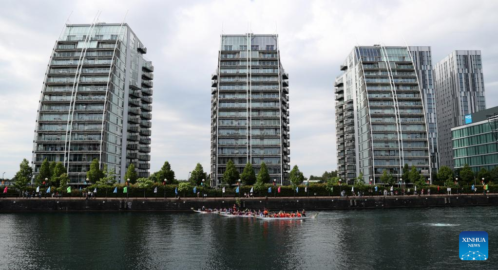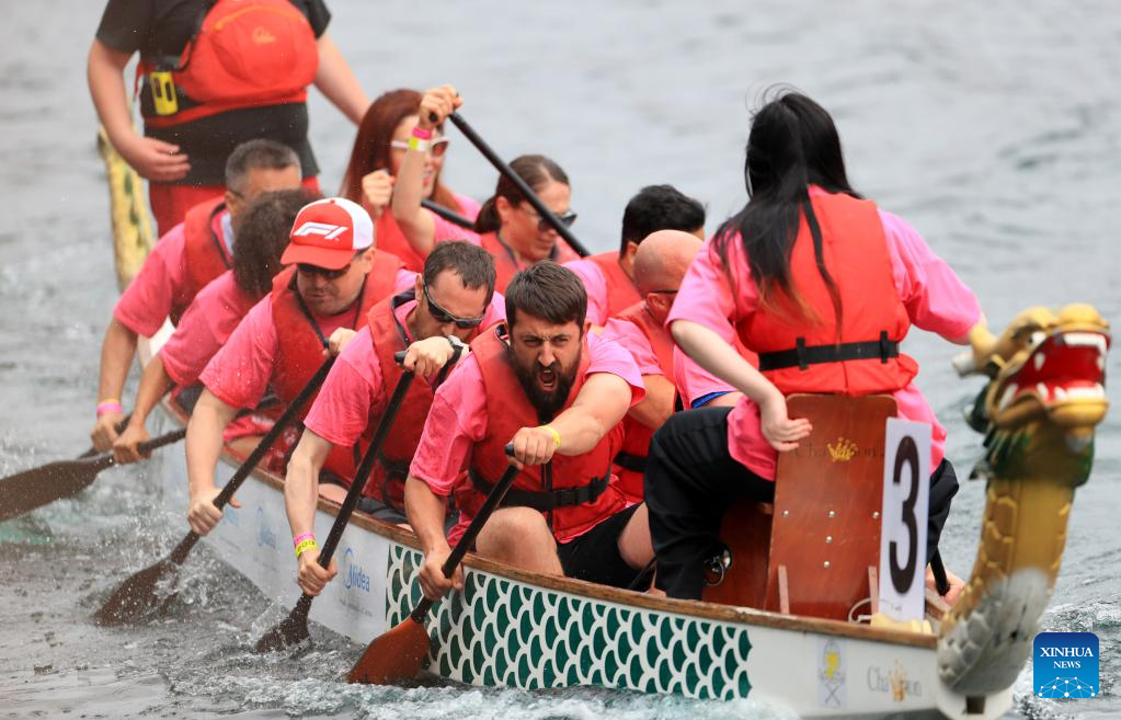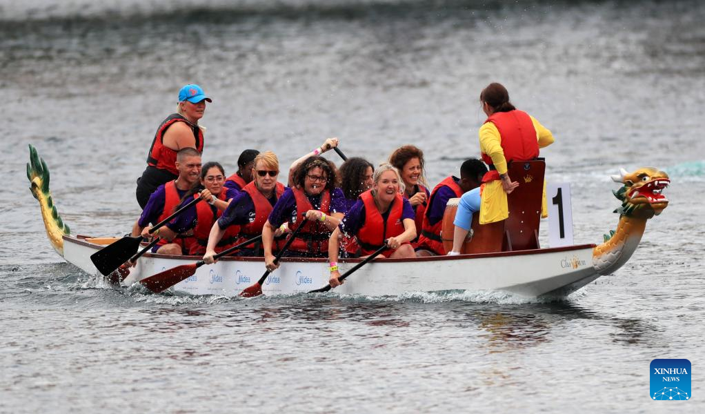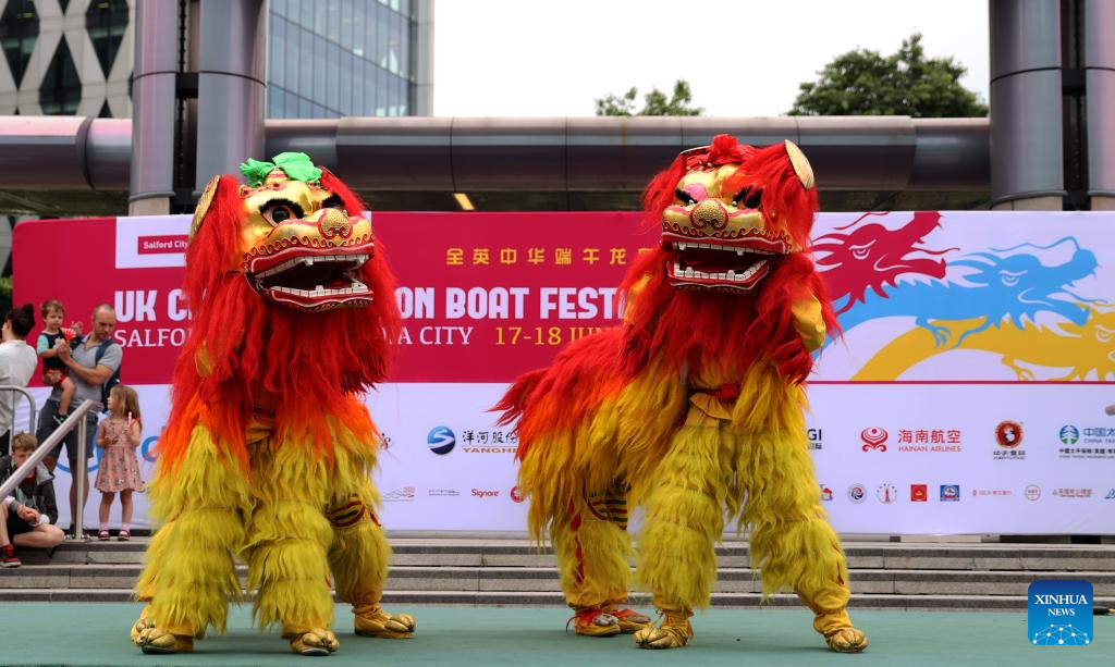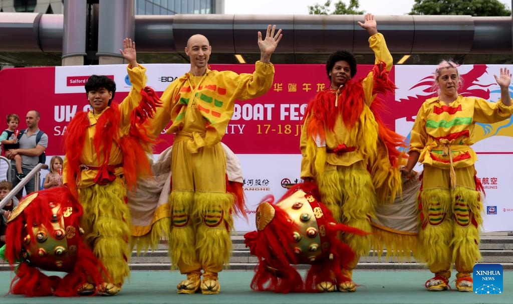 MANCHESTER, Britain, June 17 (Xinhua) -- The moment the starting signal rang out at Salford Quays in Greater Manchester on Saturday, three dragon boats swiftly surged forward, with paddlers unleashing powerful strokes in sync with the pulsating beats set by drummers at the front of the boats.