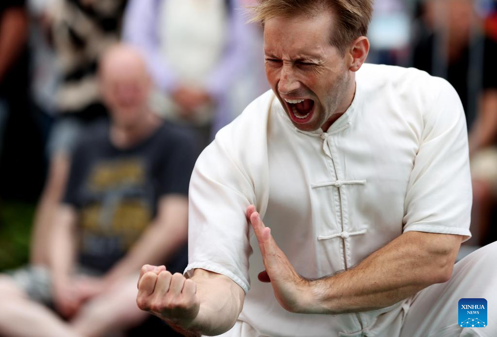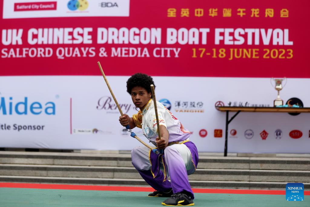 A man performs Chinese martial arts the 2023 UK Chinese Dragon Boat Festival in Salford, Britain, June 17, 2023. The festival also featured traditional Chinese lion dance, singing, martial art and calligraphy, making it great fun for spectators and participants. (Xinhua/Li Ying)