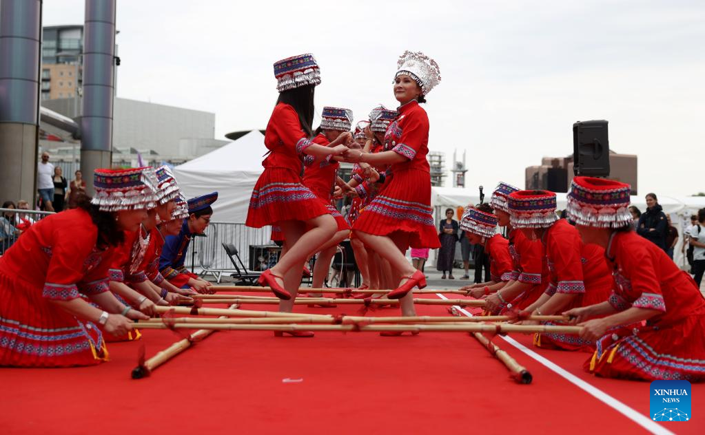 People perform Bamboo Dance during the 2023 UK Chinese Dragon Boat Festival in Salford, Britain, June 17, 2023. The festival also featured traditional Chinese lion dance, singing, martial art and calligraphy, making it great fun for spectators and participants. (Xinhua/Li Ying)