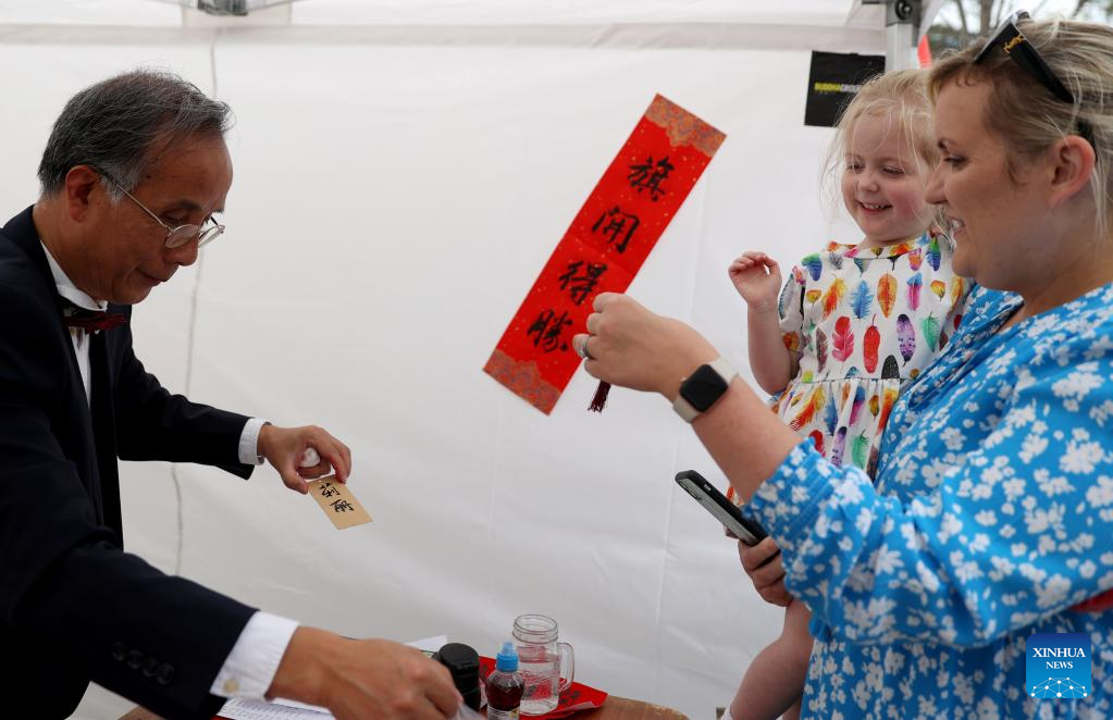 A calligrapher gives a name card written in Chinese to the little girl during the 2023 UK Chinese Dragon Boat Festival in Salford, Britain, June 17, 2023. The festival also featured traditional Chinese lion dance, singing, martial art and calligraphy, making it great fun for spectators and participants. (Xinhua/Li Ying)