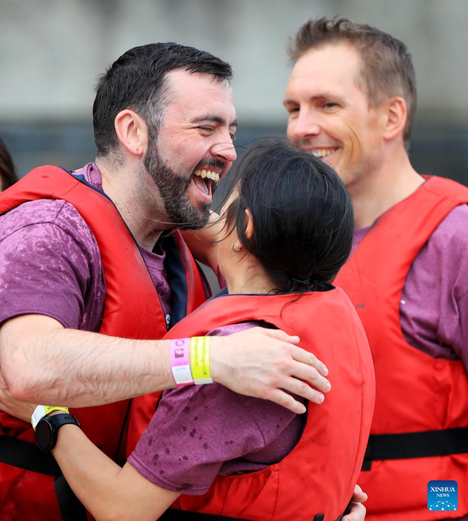 Contestants celebrate during the 2023 UK Chinese Dragon Boat Festival in Salford, Britain, June 17, 2023. The festival also featured traditional Chinese lion dance, singing, martial art and calligraphy, making it great fun for spectators and participants. (Xinhua/Li Ying)