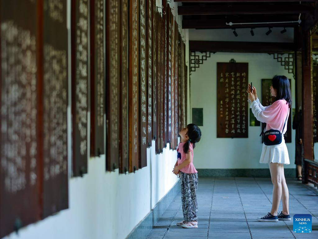 Visitors watch woodcuts at the Du Fu Thatched Cottage in Chengdu, southwest China's Sichuan Province, June 12, 2023. Chengdu, a historical city in southwest China's Sichuan Province, is home to treasured cultural and historical sites, including Sanxingdui Ruins, Jinsha Site Museum, and Dujiangyan irrigation system. In recent years, Chengdu has witnessed the rapid development of its cultural and creative industry, showcasing its vitality, creativeness and energy. (Xinhua/Shen Bohan)