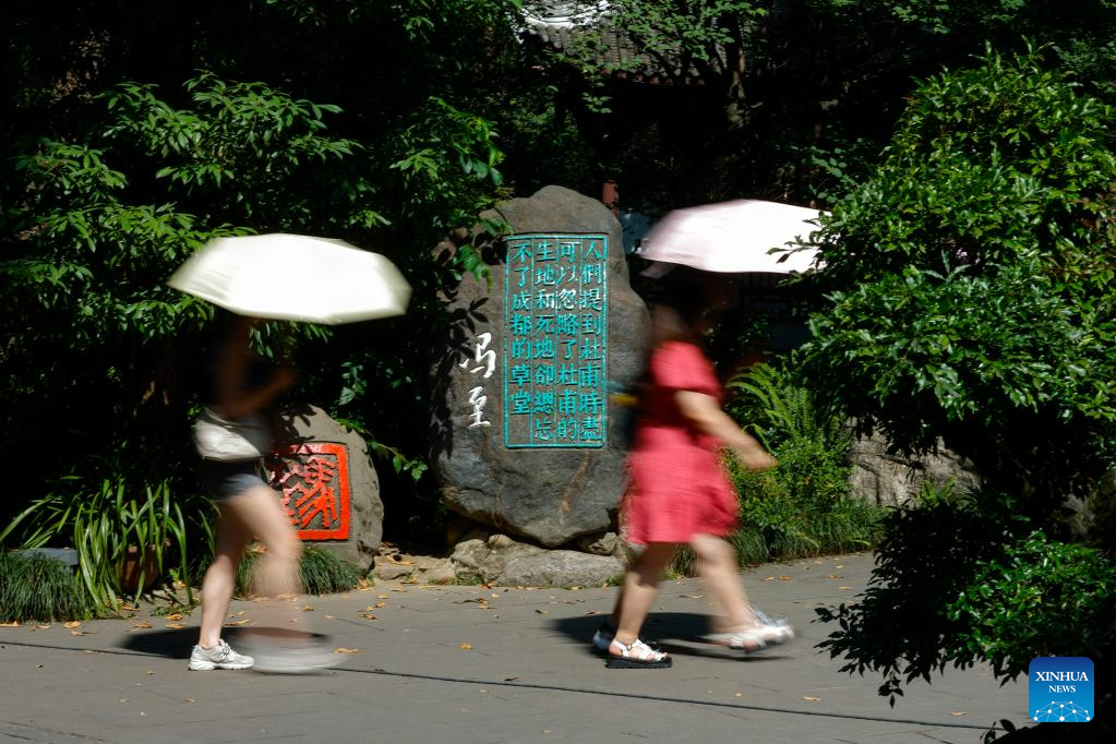 People visit the Du Fu Thatched Cottage in Chengdu, southwest China's Sichuan Province, June 12, 2023. Chengdu, a historical city in southwest China's Sichuan Province, is home to treasured cultural and historical sites, including Sanxingdui Ruins, Jinsha Site Museum, and Dujiangyan irrigation system. In recent years, Chengdu has witnessed the rapid development of its cultural and creative industry, showcasing its vitality, creativeness and energy. (Xinhua/Shen Bohan)