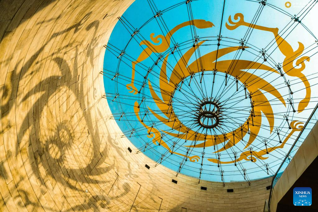 This photo taken on March 10, 2023 shows a view of the dome of the Jinsha Site Museum in Chengdu, southwest China's Sichuan Province. Chengdu, a historical city in southwest China's Sichuan Province, is home to treasured cultural and historical sites, including Sanxingdui Ruins, Jinsha Site Museum, and Dujiangyan irrigation system. In recent years, Chengdu has witnessed the rapid development of its cultural and creative industry, showcasing its vitality, creativeness and energy. (Photo by Zhang Yan/Xinhua)