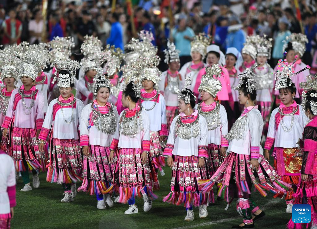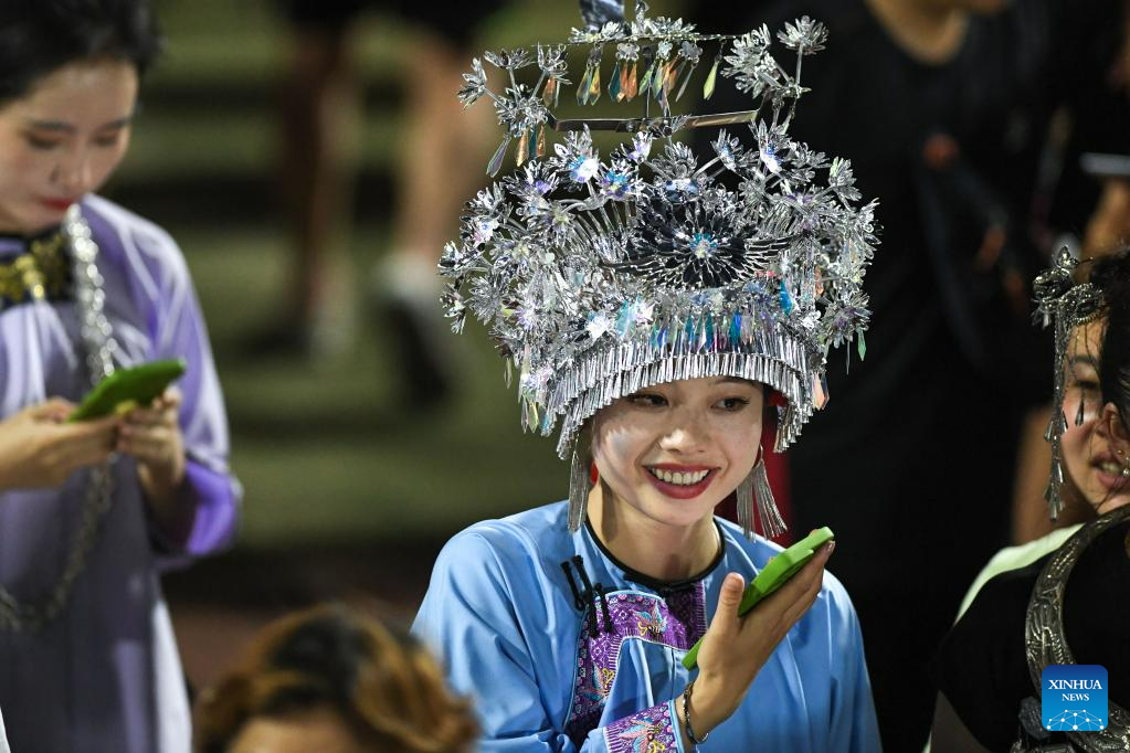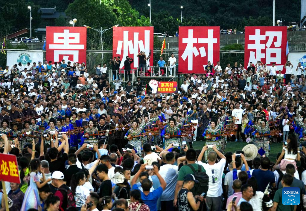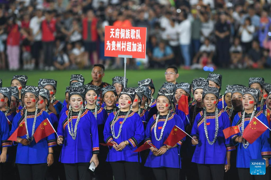 Villagers wearing festive ethnic are seen during the "Village Super League" football match in Rongjiang County of southwest China's Guizhou Province, June 17, 2023. Villagers spontaneously wear ethnic dress and perform singing and dancing on every match day on weekends. (Xinhua/Yang Wenbin)