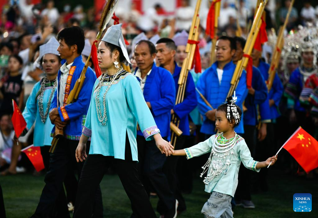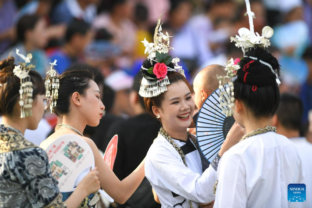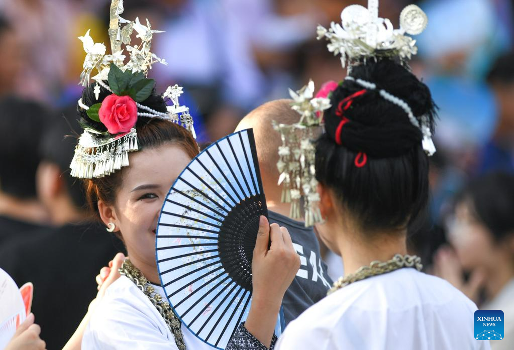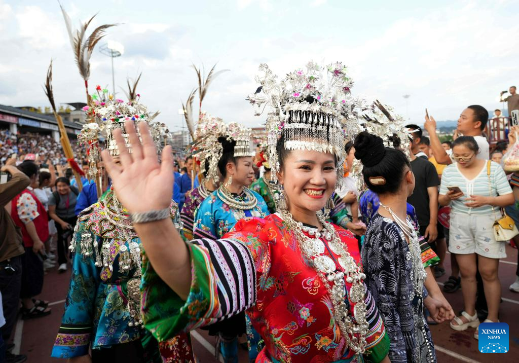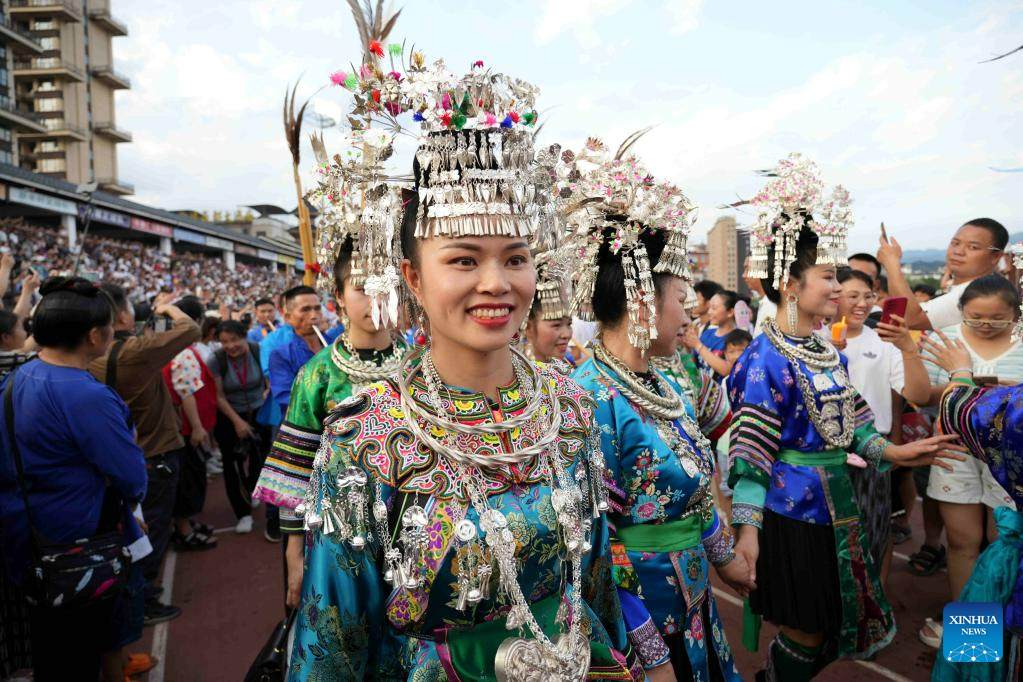 Villagers wearing festive ethnic are seen during the "Village Super League" football match in Rongjiang County of southwest China's Guizhou Province, June 17, 2023. Villagers spontaneously wear ethnic dress and perform singing and dancing on every match day on weekends. (Xinhua/Yang Wenbin)