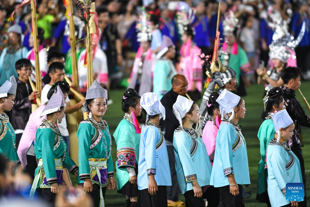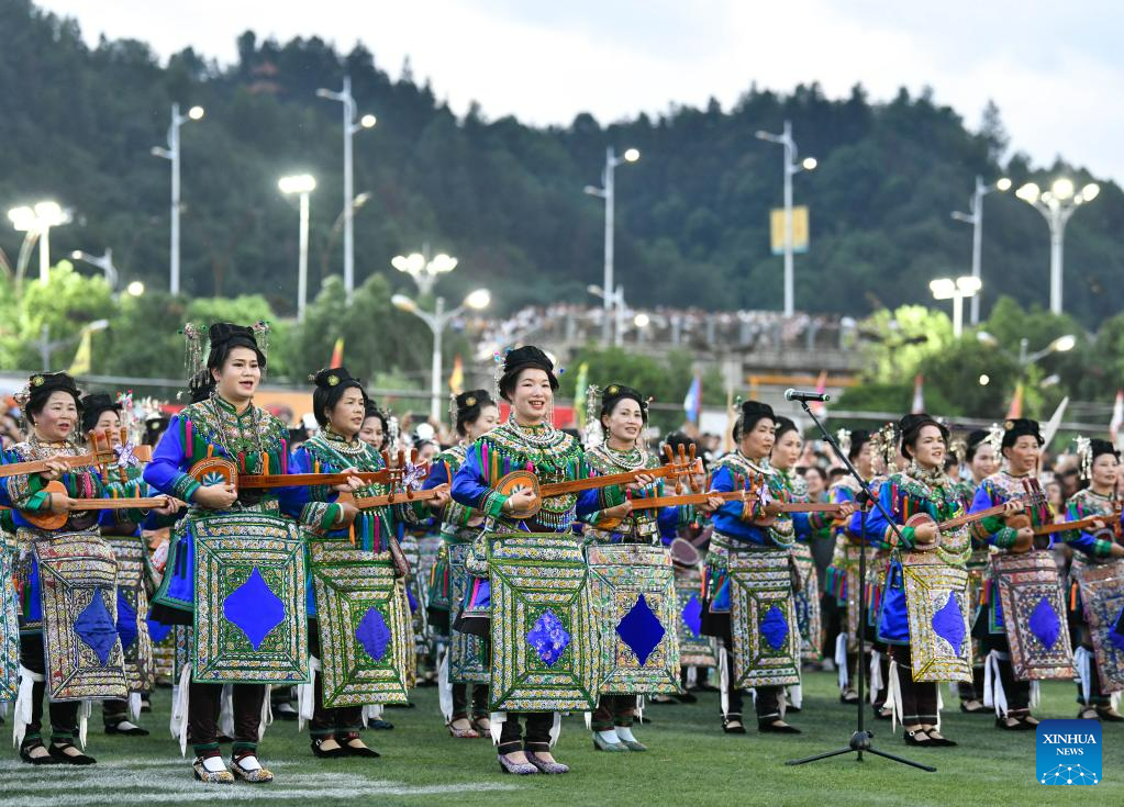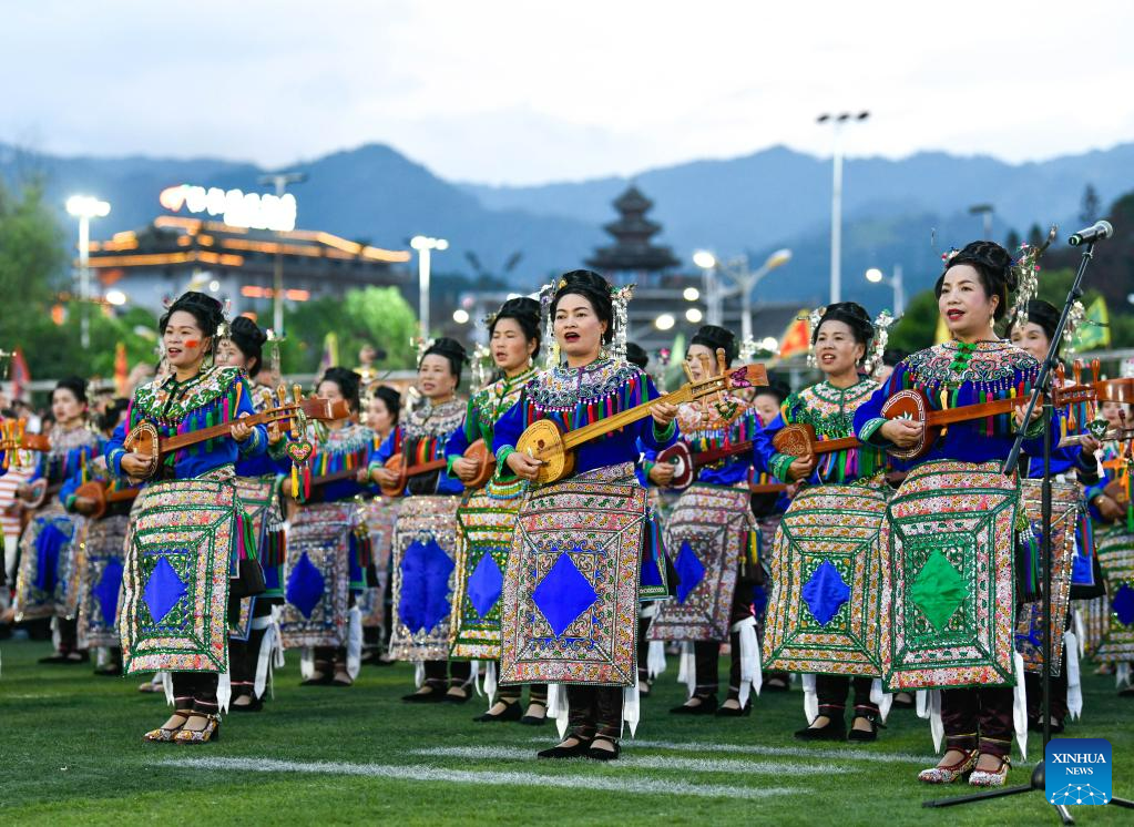 Villagers in ethnic dress give performance for "Village Super League" football match in Guizhou