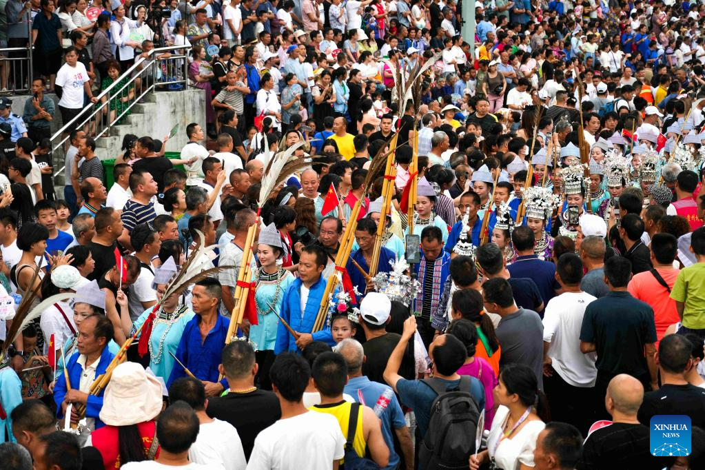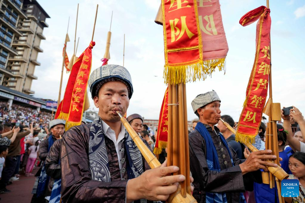 Villagers wearing festive ethnic dress and peforming Lusheng, a musical instrument of Miao ethnic group, enter the stadium before the "Village Super League" football match in Rongjiang County of southwest China's Guizhou Province, June 17, 2023. Villagers spontaneously wear ethnic dress and perform singing and dancing on every match day on weekends. (Photo by Wang Bingzhen/Xinhua)