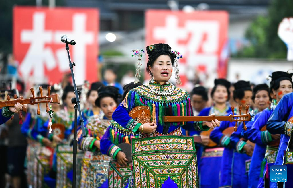 Villagers of Dong ethnic group wearing festive ethnic dress perform singing during the halftime of the "Village Super League" football match in Rongjiang County of southwest China's Guizhou Province, June 17, 2023. Villagers spontaneously wear ethnic dress and perform singing and dancing on every match day on weekends. (Xinhua/Yang Wenbin)