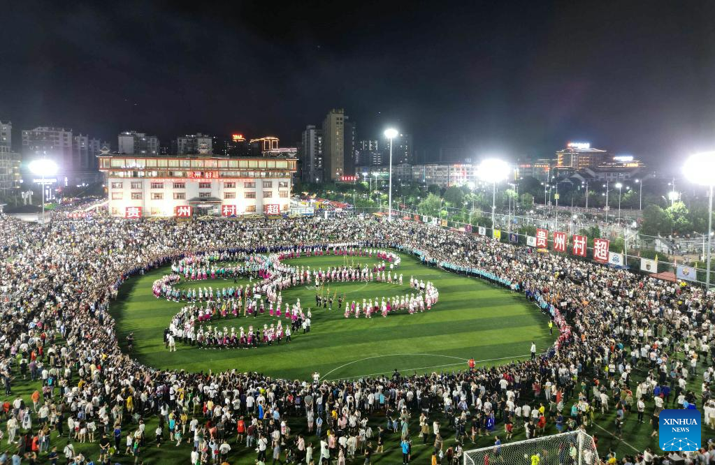 Villagers of Miao ethnic group wearing festive ethnic dress perform dancing during the halftime of the "Village Super League" football match in Rongjiang County of southwest China's Guizhou Province, June 17, 2023. Villagers spontaneously wear ethnic dress and perform singing and dancing on every match day on weekends. (Xinhua/Yang Wenbin)