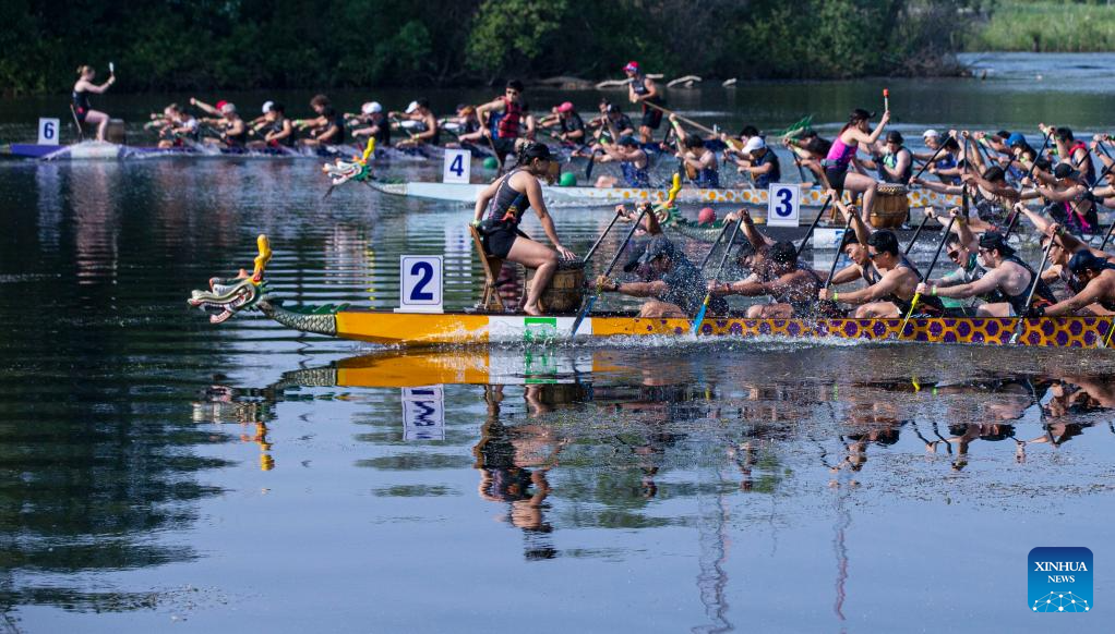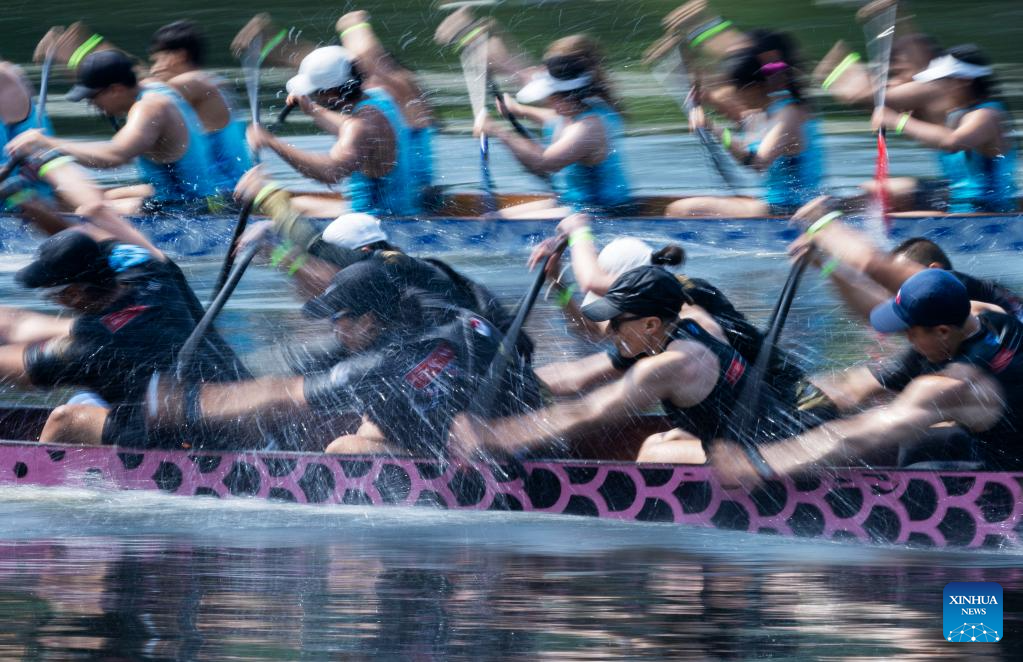 Participants compete during the 2023 Toronto International Dragon Boat Race Festival in Toronto, Canada, on June 17, 2023. This annual two-day event kicked off here on Saturday with hundreds of participants from around the world participating. (Photo by Zou Zheng/Xinhua)