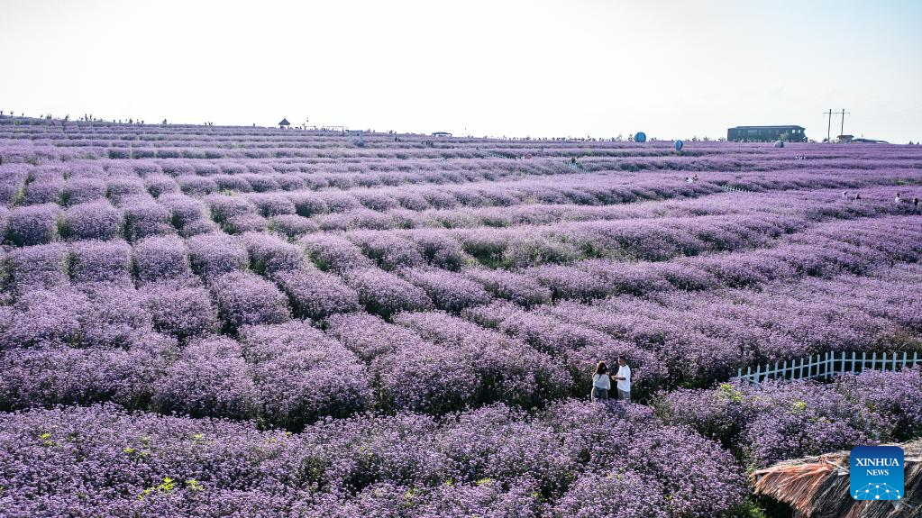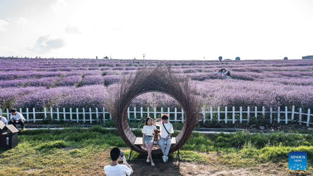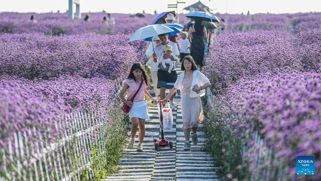 Tourists enjoy themselves in a verbena field in Gaopo Township of Guiyang, southwest China's Guizhou Province, June 17, 2023. (Xinhua/Tao Liang)