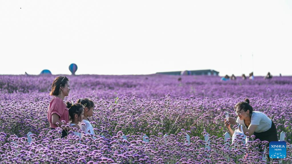 Tourists take photos in a verbena field in Gaopo Township of Guiyang, southwest China's Guizhou Province, June 17, 2023. (Xinhua/Tao Liang)