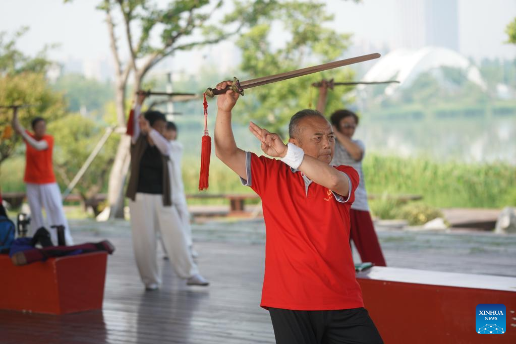 People exercise at the Sanwan canal scenic area in Yangzhou, east China's Jiangsu Province, June 15, 2023. (Xinhua/Ji Chunpeng)