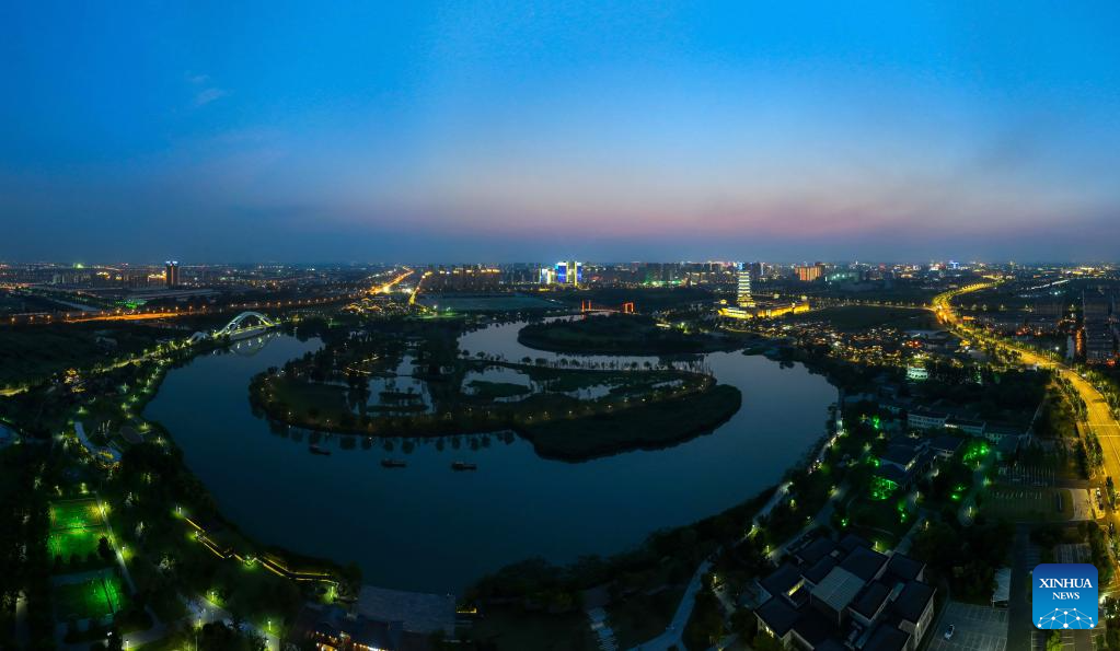 This aerial photo taken on June 14, 2023 shows a night view of the Grand Canal in Yangzhou, east China's Jiangsu Province. (Xinhua/Yang Lei)