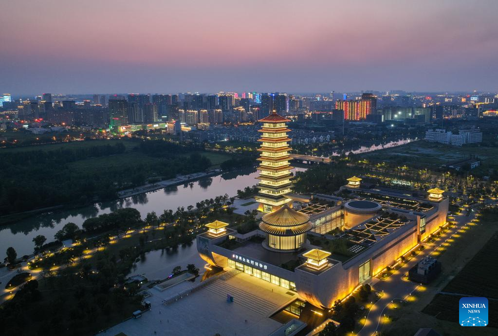 This aerial photo taken on June 14, 2023 shows a night view of China Grand Canal Museum along the Grand Canal in Yangzhou, east China's Jiangsu Province. (Xinhua/Ji Chunpeng)